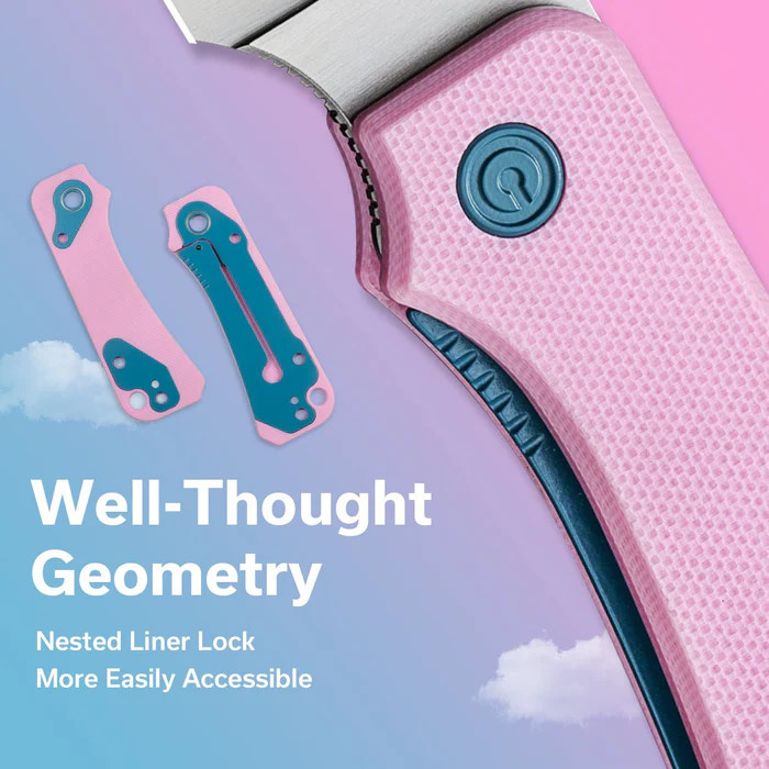 The powder pink G10 handle offers a comfortable and secure grip while keeping the knife extremely lightweight. Stylish teal-painted hardware accents add a unique modern look. The ceramic ball bearing pivot system ensures smooth one-hand opening, while the nested liner lock mechanism provides safe and secure blade locking.