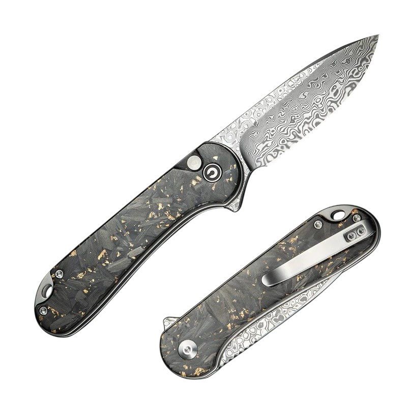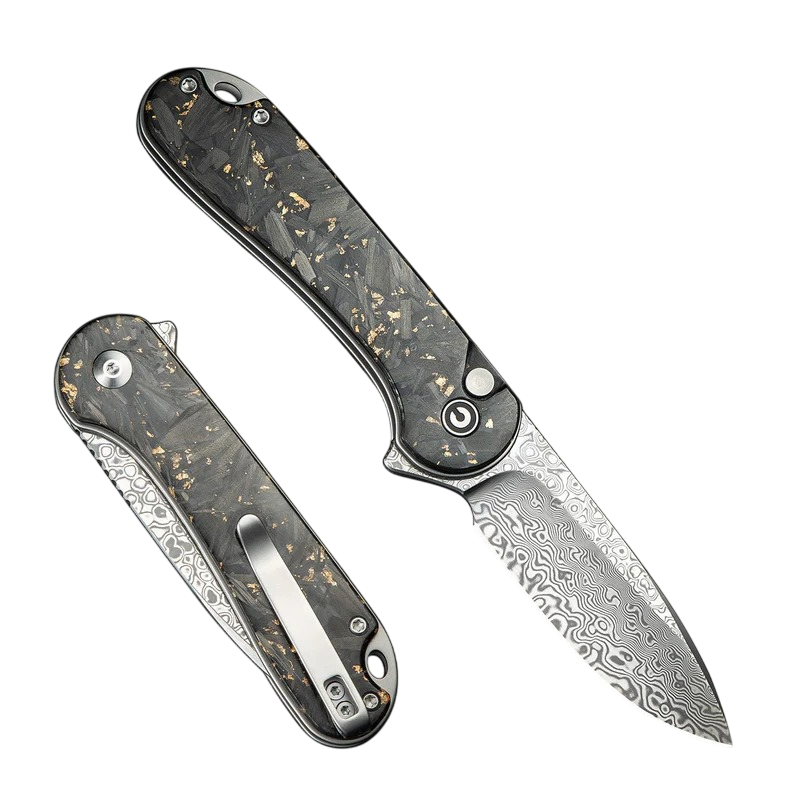 CIVIVI Elementum II C18062P-10: A pocket-sized masterpiece—Damascus blade, resin-infused carbon & gold handle, ultra-smooth button-lock action—where elegance meets everyday excellence.