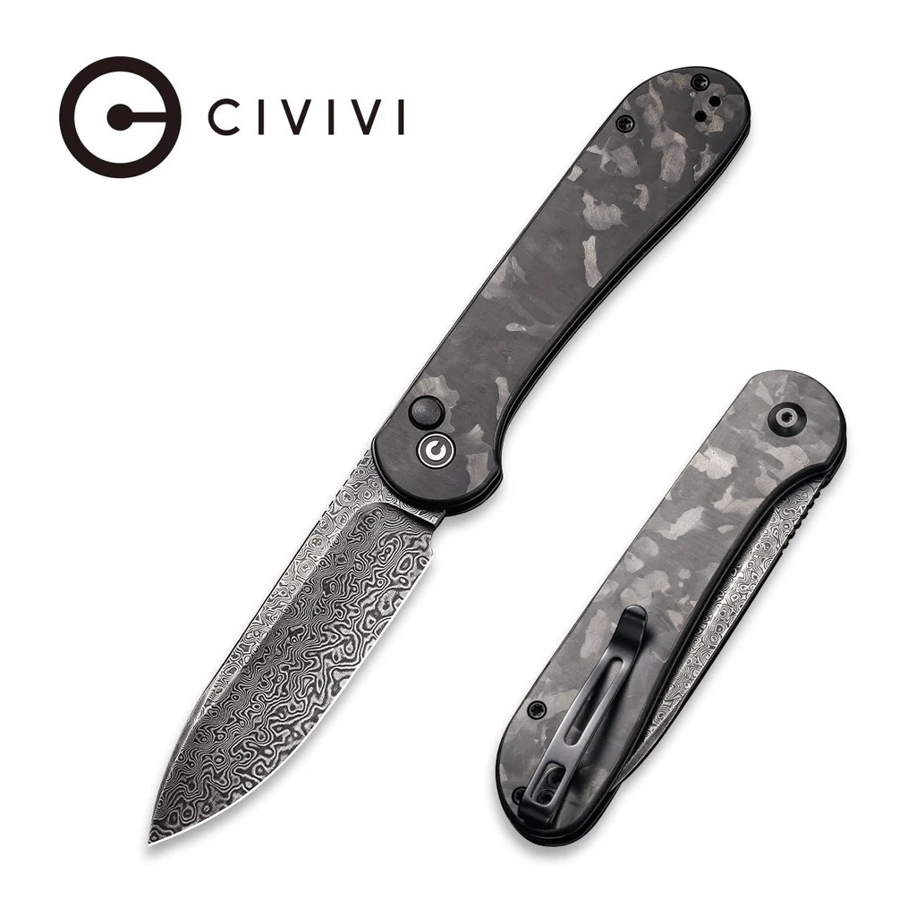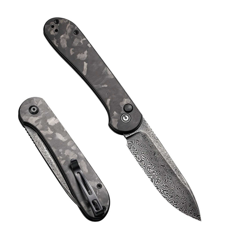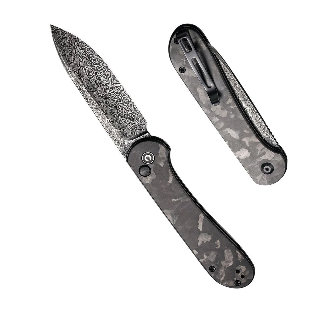 The CIVIVI Button Lock Elementum elevates the classic with modern flair. It features a stunning black hand-rubbed Damascus blade, a sleek marble carbon fiber handle, and a fidget-friendly button lock mechanism.