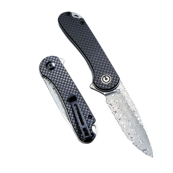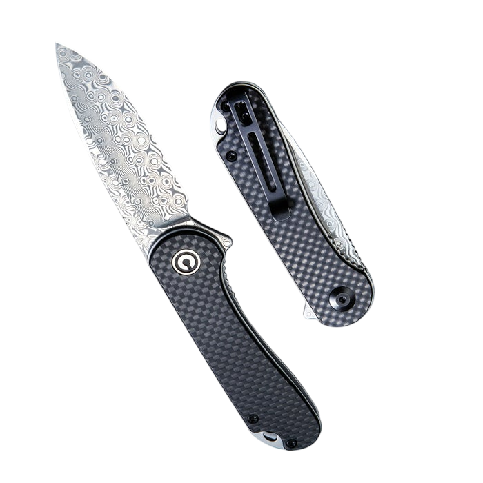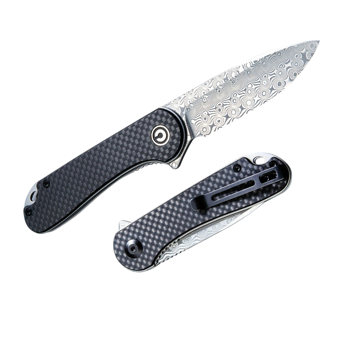 The CIVIVI Elementum blends classic style with premium flair. It features a stunning Damascus blade and a lightweight handle with a sleek twill carbon fiber overlay on Black G10.