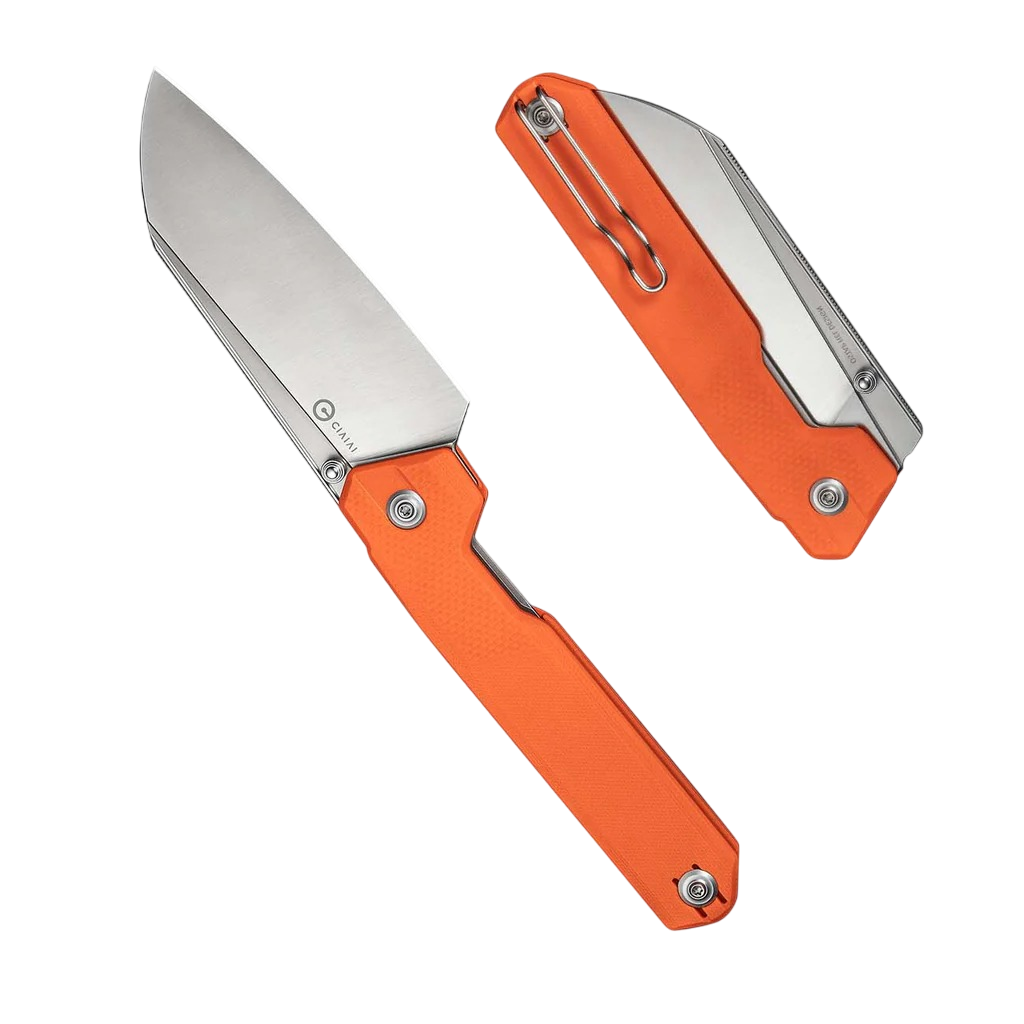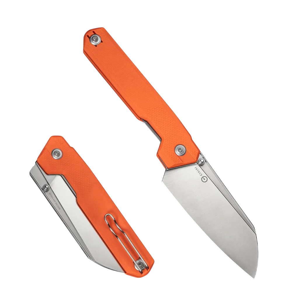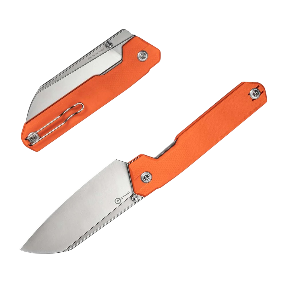CIVIVI Hid C23008-4: A rugged reverse-tanto folder with bright orange G10, satin-finished 14C28N blade, smooth ball-bearing action, secure liner lock, and ambidextrous carry—sharp, reliable, and ready for anything.