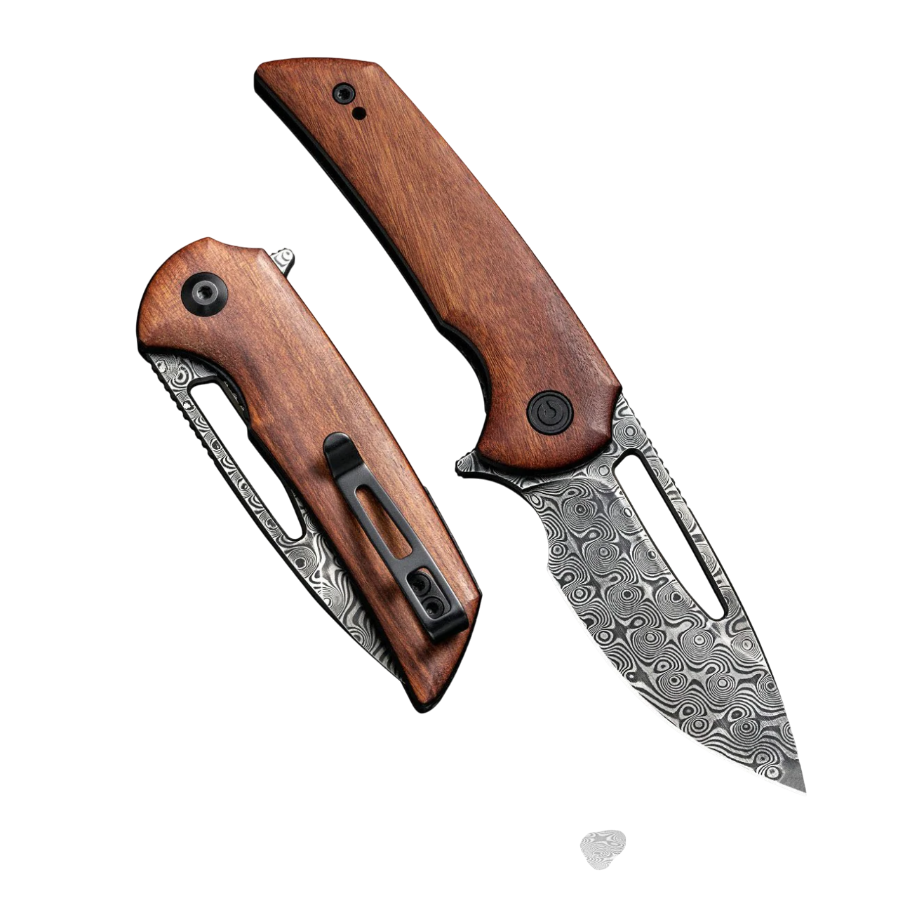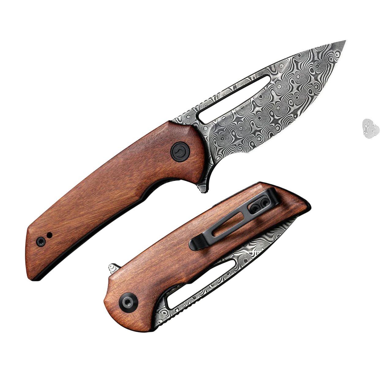 The CIVIVI Odium is a compact powerhouse with classic style. It features a stunning black hand-rubbed Damascus blade and a warm, natural Guibourtia wood handle for a sophisticated carry.