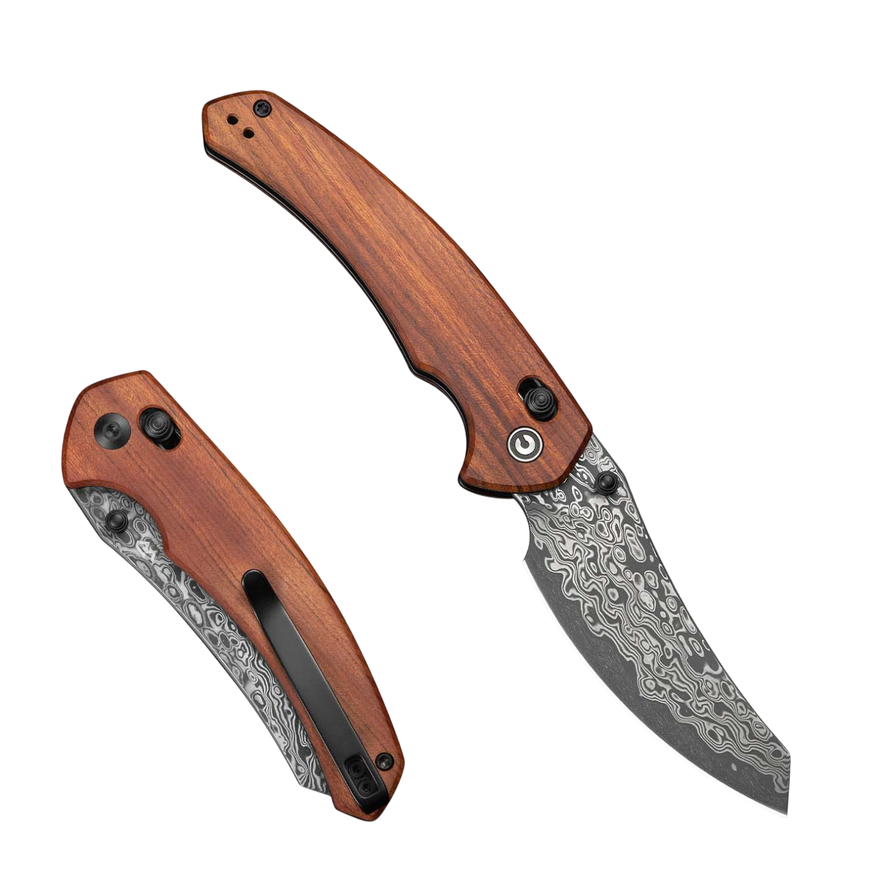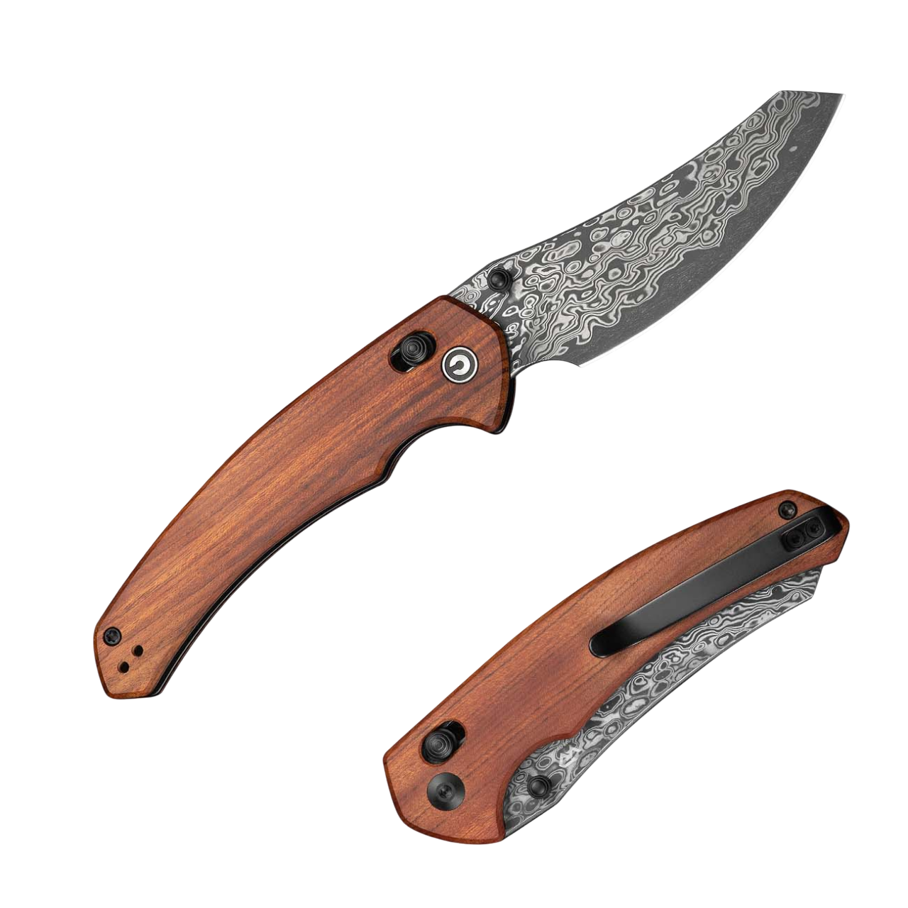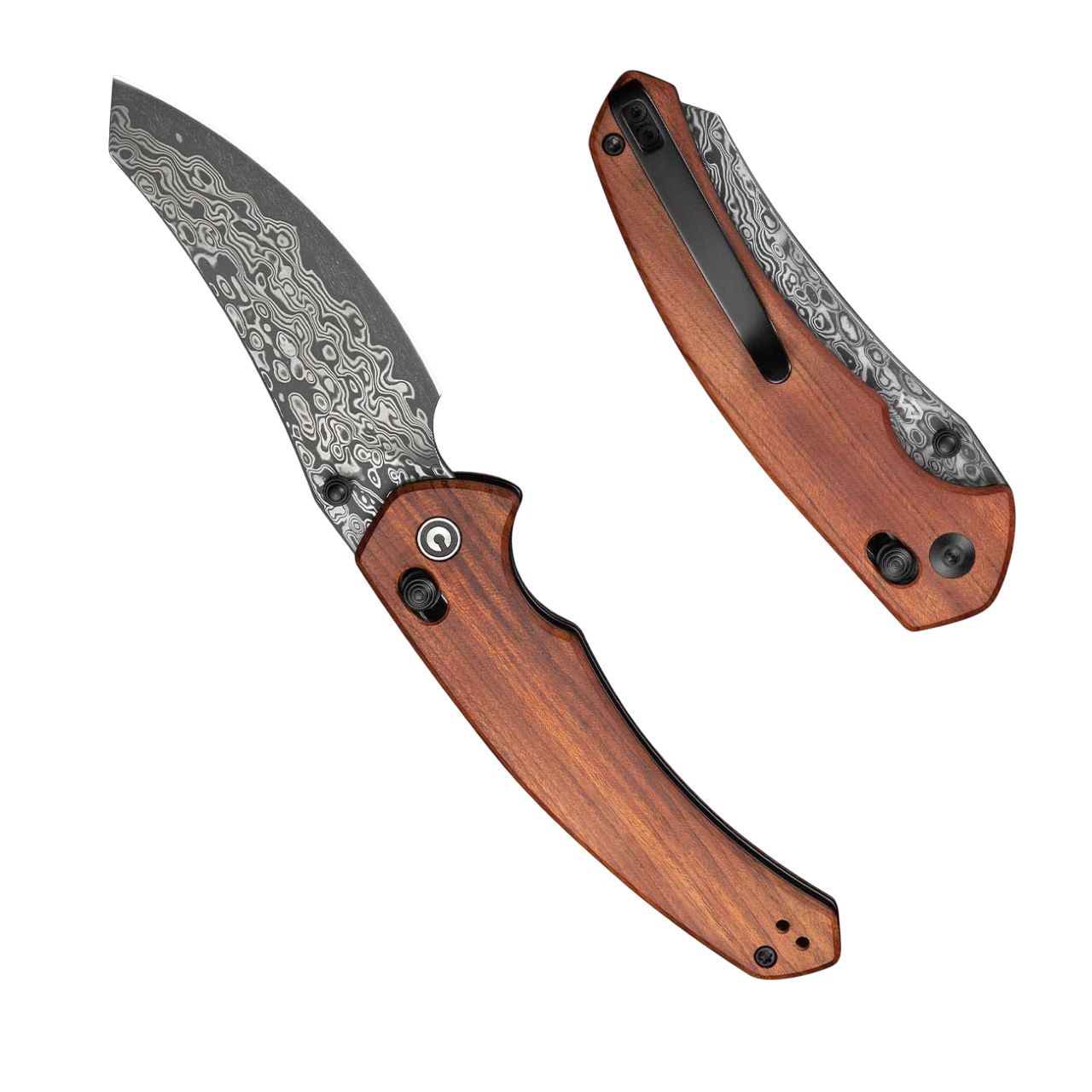 The CIVIVI Sixgill is a sleek, modern front flipper with classic warmth. It features a stunning Damascus blade and a handsome Guibourtia wood handle for a sophisticated, artful carry.