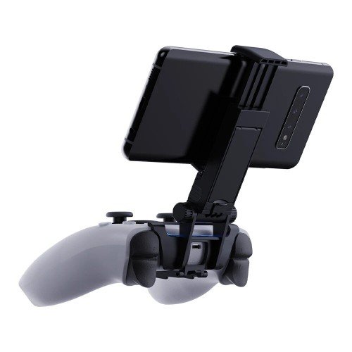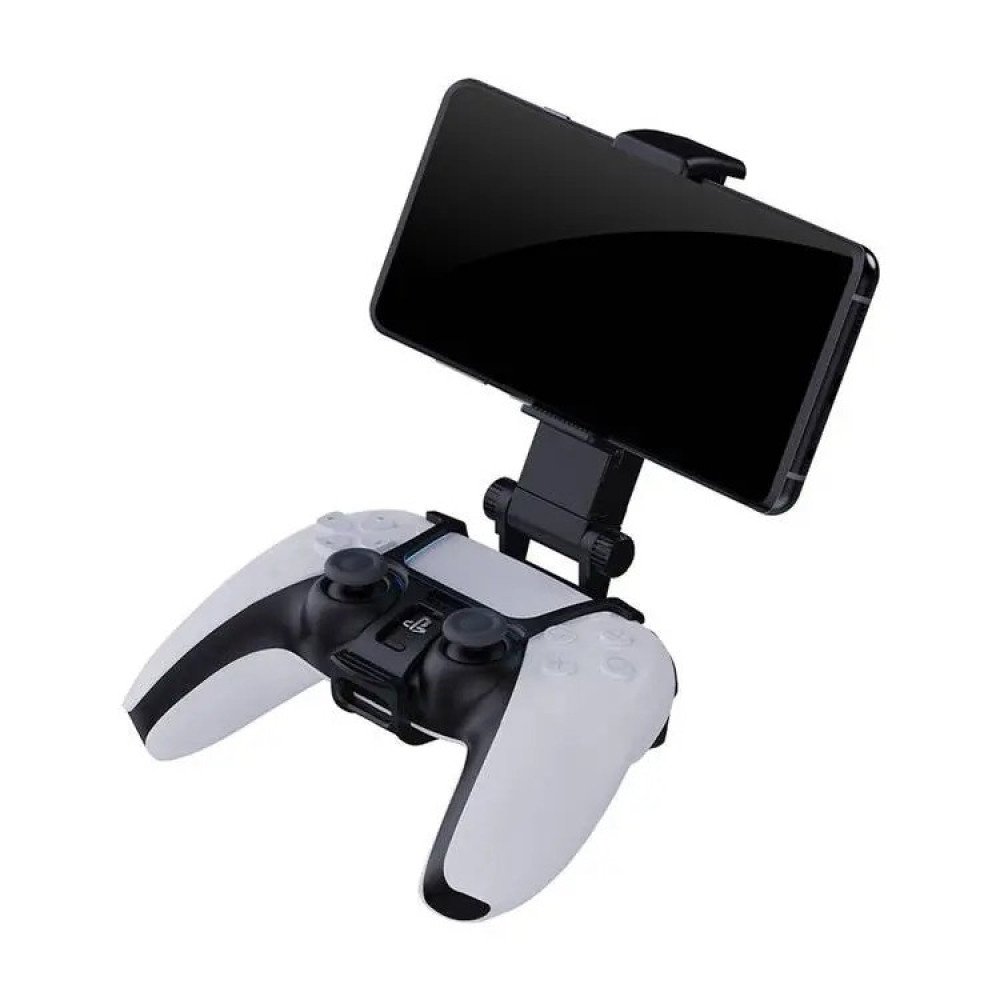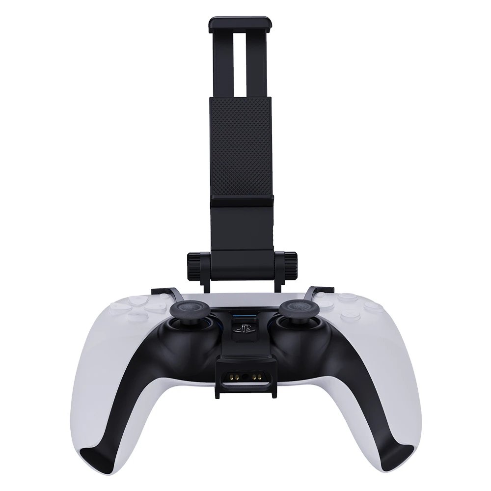 A smart phone holder designed to snap securely onto your PlayStation 5 DualSense controller, turning it into a mobile gaming rig at your ideal viewing angle.