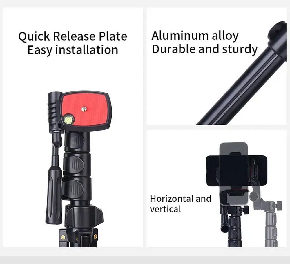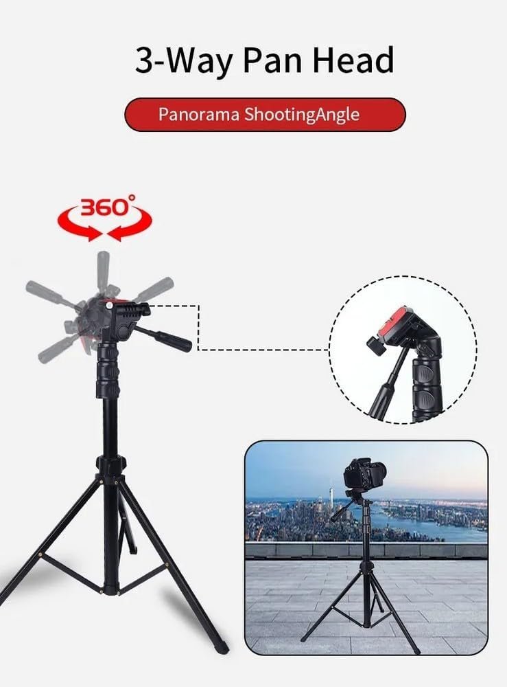 Crafted from durable aluminum alloy and ABS, the tripod offers strong support for DSLR cameras, smartphones, ring lights, and fill lights while remaining lightweight and easy to carry. Its 3D panoramic pan-tilt head allows smooth 360° rotation, helping you capture the perfect angle for landscape shots, portraits, live streaming, or video recording.