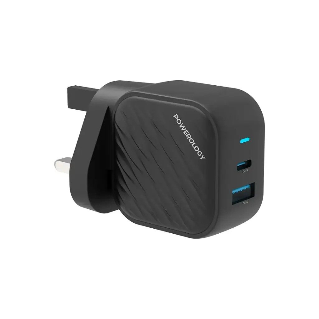 Powerology 45W PD GaN Dual-Port Wall Charger (Model: PWCUQC036) – Compact and powerful with GaN technology, featuring dual ports for efficient fast charging of multiple devices.