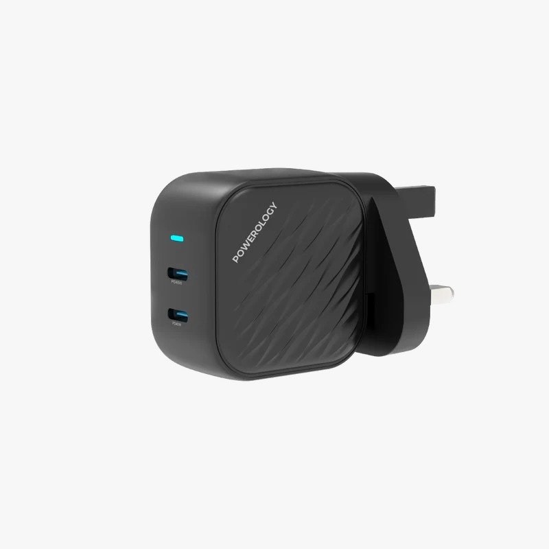Powerology 45W PD GaN Dual USB-C Charger (Model: PWCUQC035) – Sleek and efficient, delivers fast charging via dual USB-C ports with advanced GaN technology for compact power on the go.