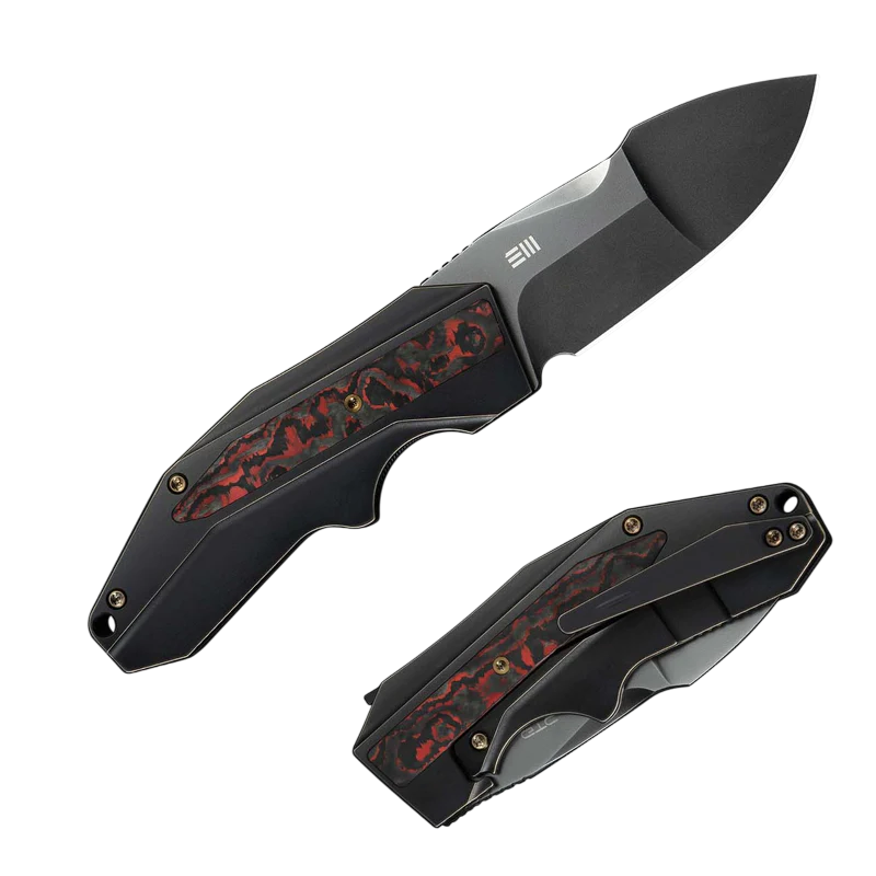 The WE Coral is a masterpiece of modern materials. It features a polished gray CPM 20CV blade, a two-toned bronze and black titanium handle, and a vibrant Lava Flow FatCarbon inlay for a truly unique look.