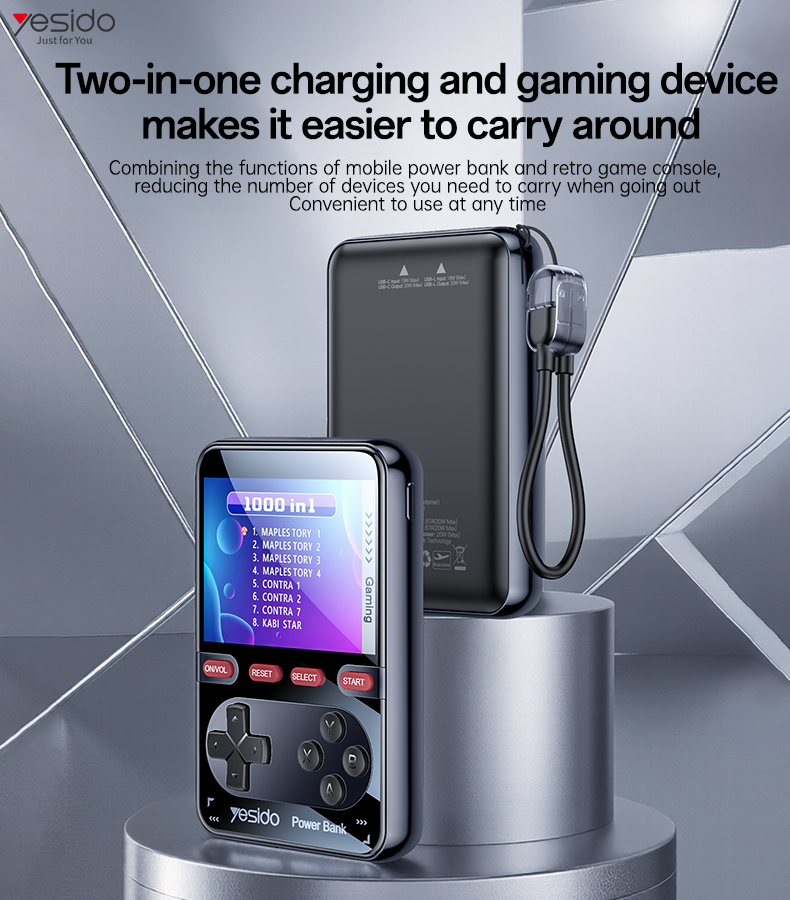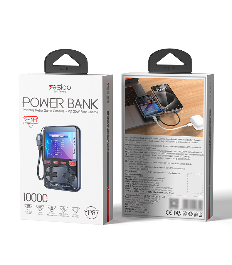 Enjoy power and entertainment in one device with the Yesido YP87 Portable Retro Game Console Power Bank. This innovative gadget combines a 10000mAh high-capacity power bank with a classic retro gaming console, giving you the perfect companion for travel, work, or leisure.