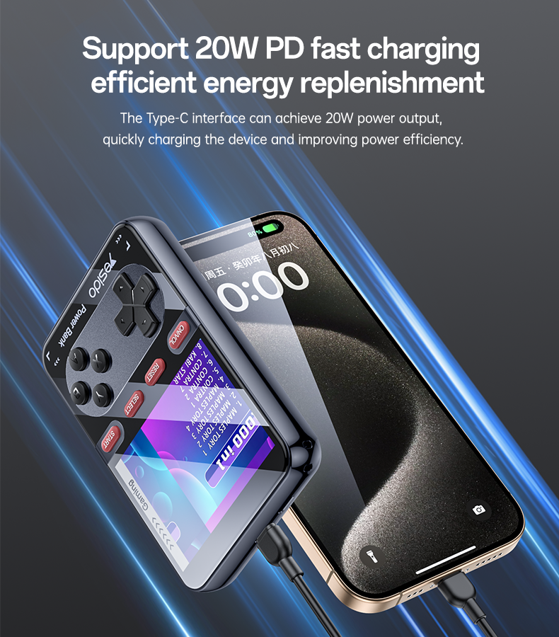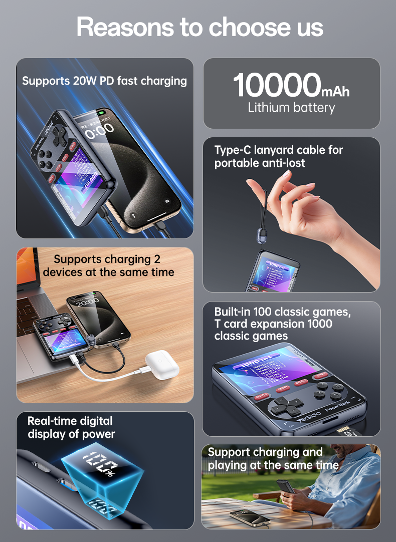 Designed for gamers and tech lovers, the YP87 allows you to play classic retro games anytime while also charging your smartphone or other devices. The built-in display and control buttons deliver a nostalgic gaming experience, while the powerful battery ensures your devices stay charged throughout the day.