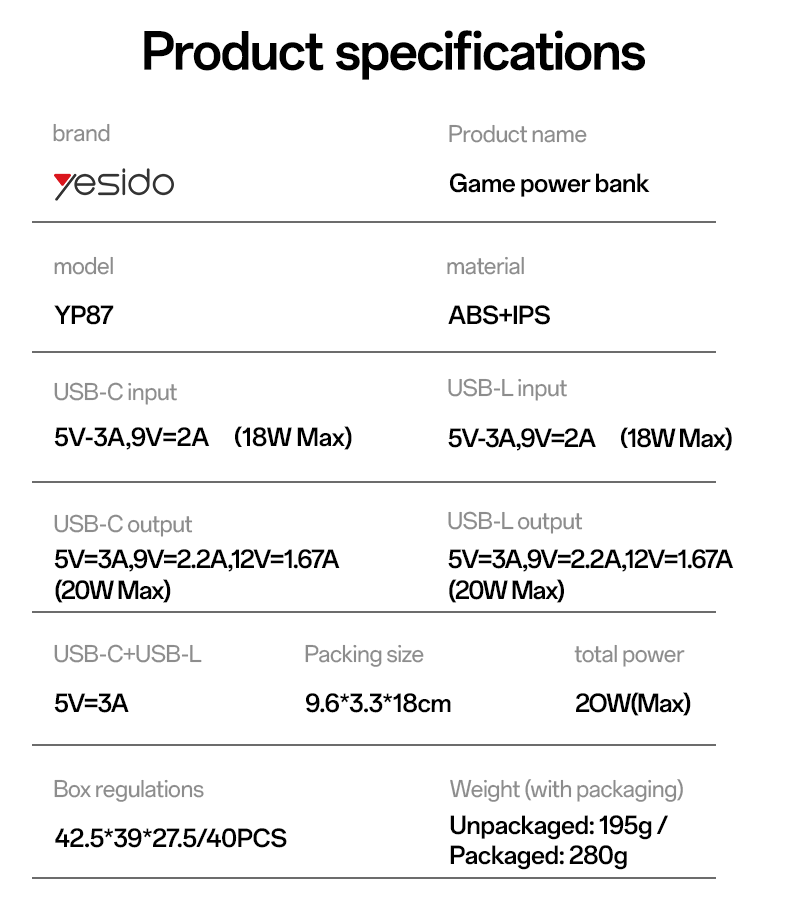 With its compact design, durable build, and multifunction capability, the Yesido YP87 is perfect for gaming, entertainment, and emergency charging on the go.